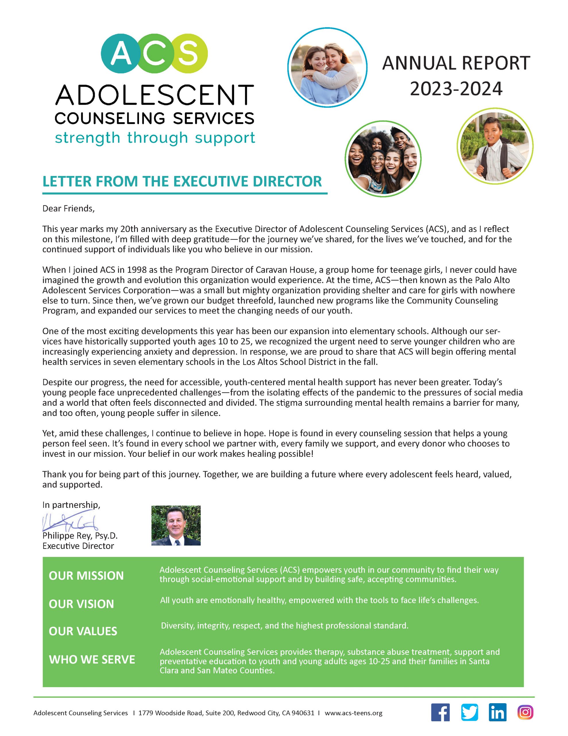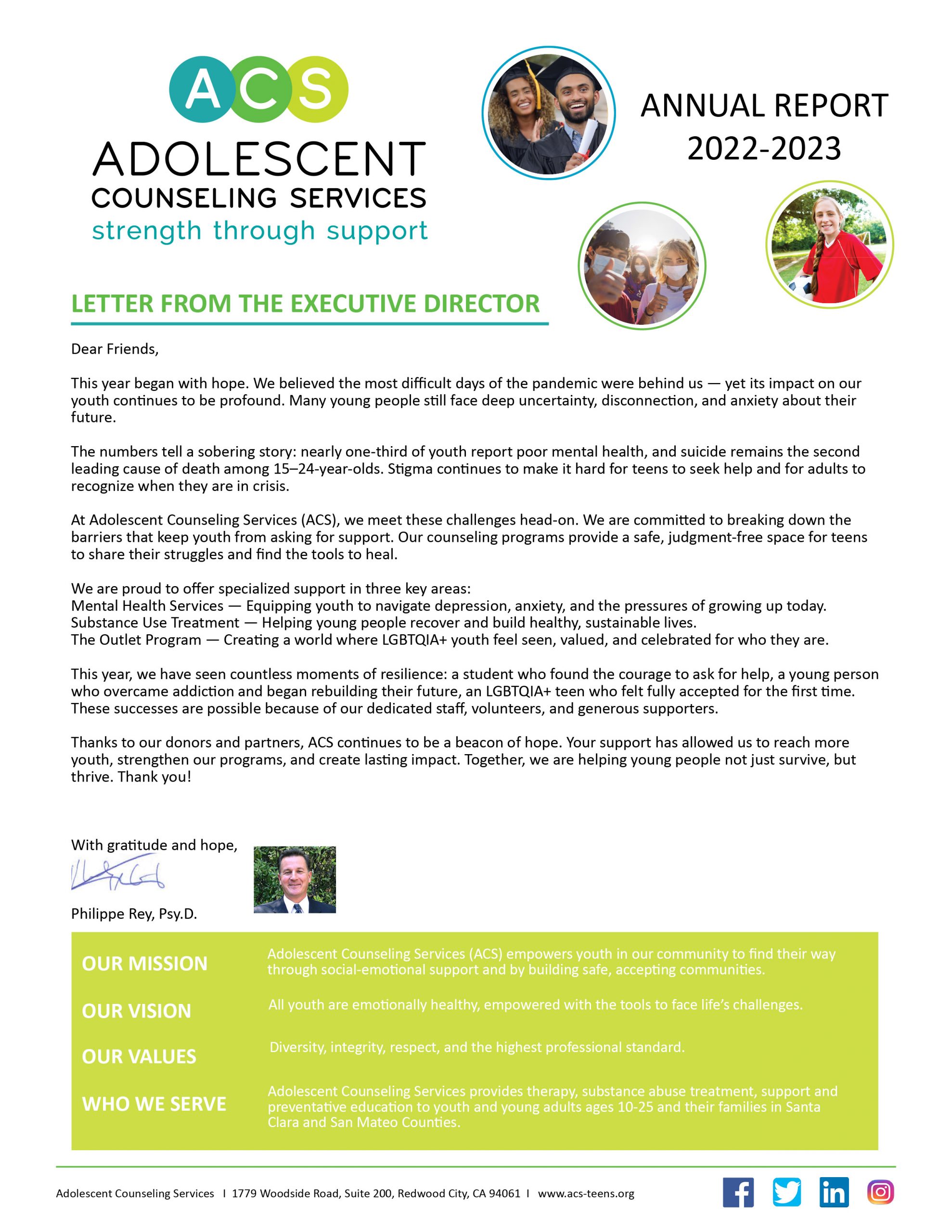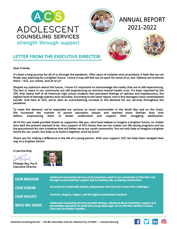 Adolescent Counseling Services is a 501(c)(3) nonprofit organization, tax identification #: 51-0192551.
