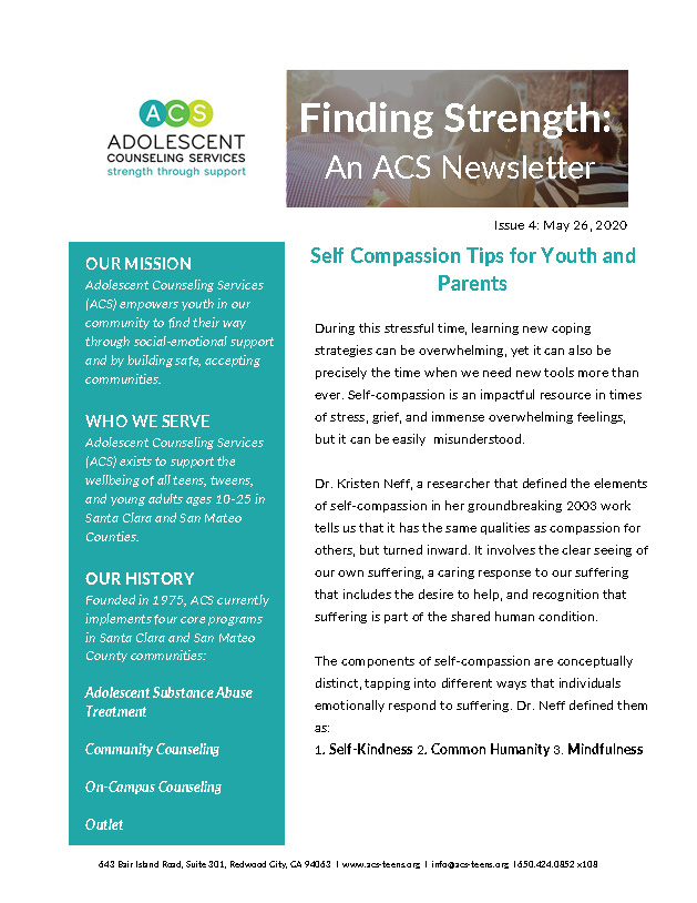 Adolescent Counseling Services (ACS) has started a weekly newsletter as a resource for young people and parents through shelter-in-place. Articles include content written by our clinicians and young clients. Please click below to view or print!